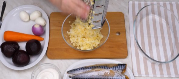 Kiaušinį išvirkite ir stambiai sutarkuokite. Nupjaukite žuvies galvą ir uodegą. Nupjaukite pelekus.