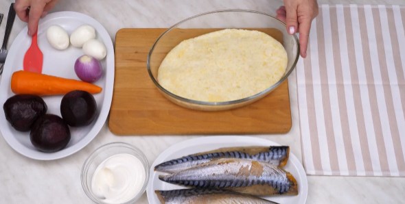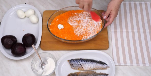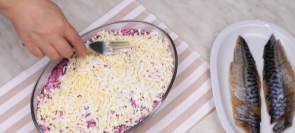 Burokėlį dedame lygiu sluoksniu ir sutepame majonezo likučiais.