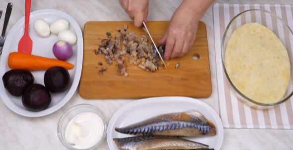 Pjaustome lygiai taip pat, kaip ir silkę – iš pradžių išilgai plonomis juostelėmis, paskui skersai smulkiais kubeliais.