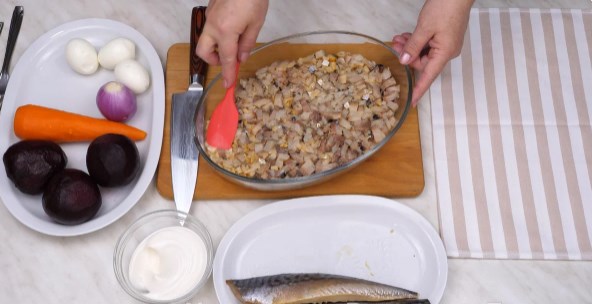 Kad šis sluoksnis nebūtų sausas, iškart sumaišome jį su nedideliu majonezo kiekiu ir dedame į serviravimo formą – tai gali būti gili lėkštė, dubuo, kulinarinis žiedas arba permatoma kepimo forma, kaip pas mane.