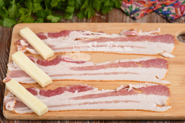 3. Sūrio gabalėlius dedame ant šoninės juostelių.