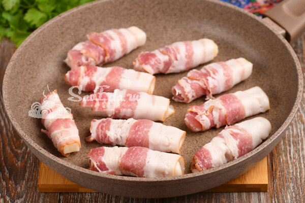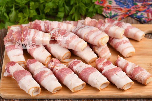 4. Sūrį susukame į šoninę, gaunasi 20 ruošinių.