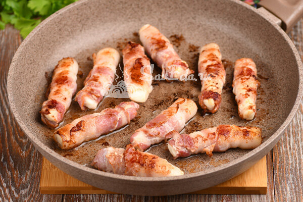 7. Skaniausią užkandį iš sūrio ir šoninės dedame į lėkštę, papildome mėgstamu padažu (pas mane iš grietinės, krapų ir česnako) ir iškart patiekiame.
