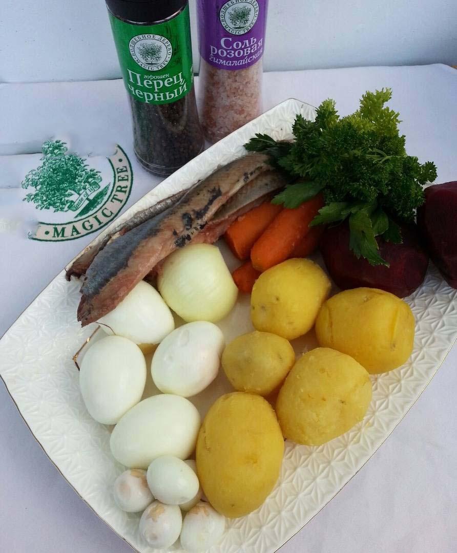 Visas daržoves išvirkite ir nulupkite, paskui stambiai sutarkuokite, išskyrus burokėlius.