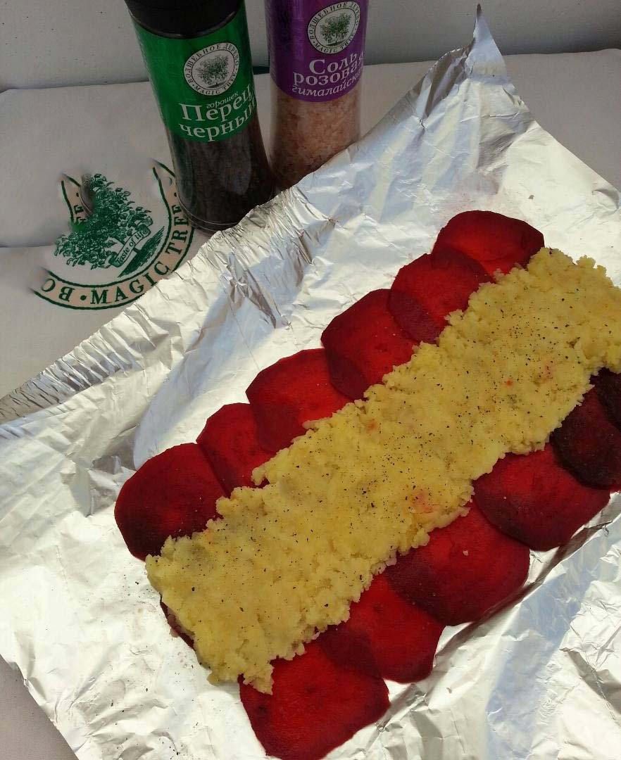 Paimkite foliją ir atkirpkite gabalą. Užtieskite ant jos plėvelę ir išdėliokite burokėlius vienu sluoksniu.