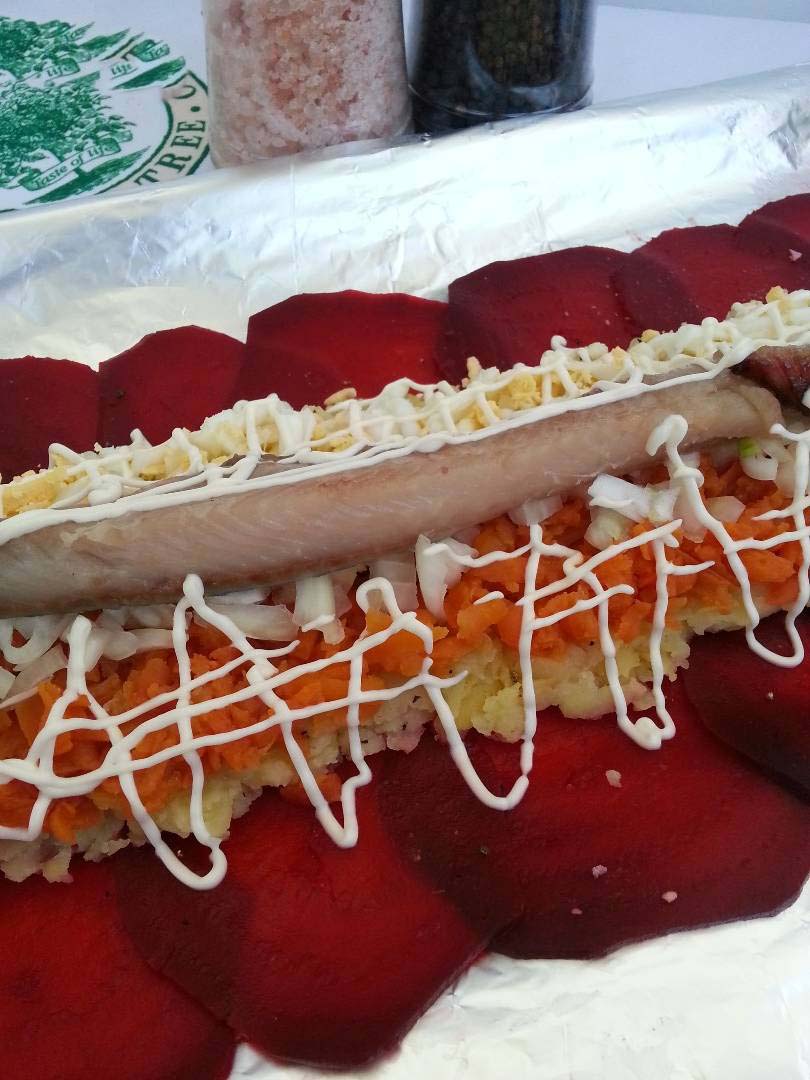 Ant pjaustytų burokėlių tolygiai paskirstykite tarkuotus ir sutepkite majonezu.