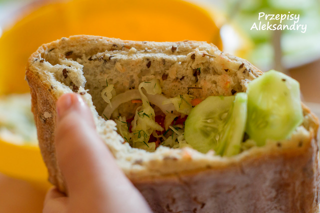 5. W bułce zrób kieszonkę i przełóż do niej surówkę, ogórki pokrojone w plastry, pomidory i cebulę pokrojoną w piórka.