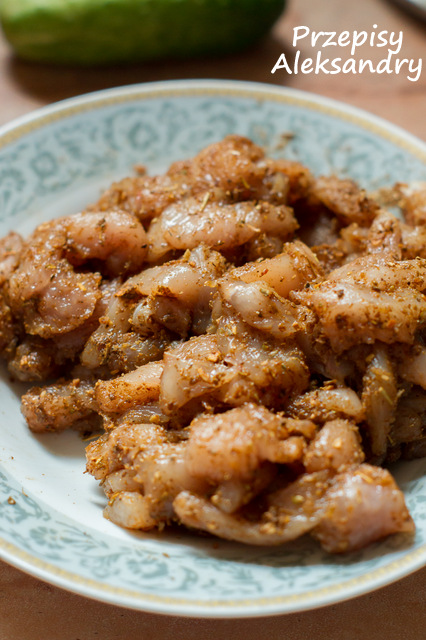 1. Mięso pokrój na małe kawałki i natrzyj przyprawą gyros. Wstaw do lodówki na kilka godzin.