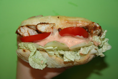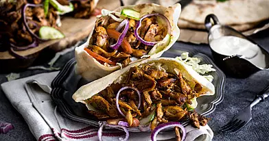 - Gorące pide rozkroić. Nakładać do środka ciepłe mięso z kurczaka rozdrobnione na mniejsze kawałki, sosy i pokrojone warzywa.